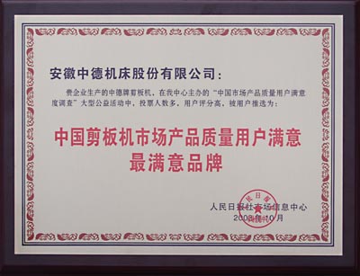 由人民日報社市場信息中心主辦、中國物流與采購聯合會、中國紡織工業協會、中國輕工機械協會等60多家權威行業協會、《工人日報》、《科技日報》等10家權威報刊、人民網及搜狐網等權威網站協辦支持,為期三個多月的“中國市場質量用戶滿意度調查”大型公益活動終于揭曉。我公司生產的中德牌剪板機,在本次公益活動中,投票人數多,用戶評分高,被用戶推選為:中國剪板機市場產品質量用戶滿意最滿意品牌。